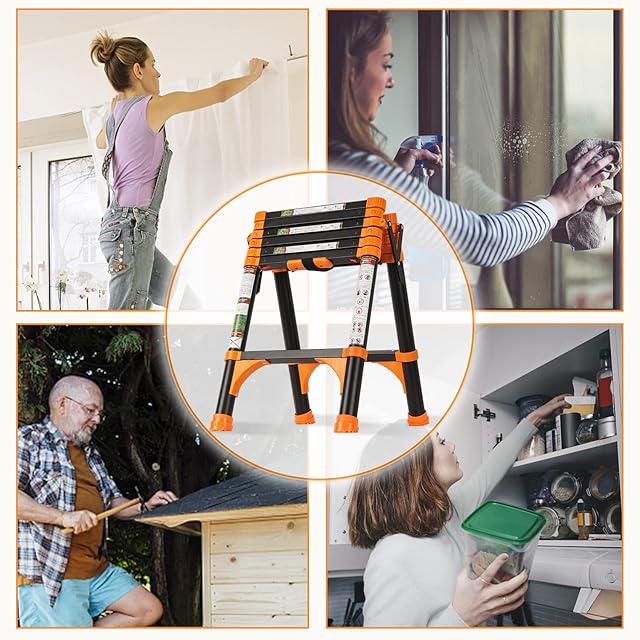 RIKADE 伸縮脚立はしご 踏み台 軽量伸縮自在 折りたたみ 持ち運び便利 室内屋外両用 アルミはしご 自動・安全ロック付き 耐荷重150 kg (ブラック+オレンジ, 1.4+1.7m)