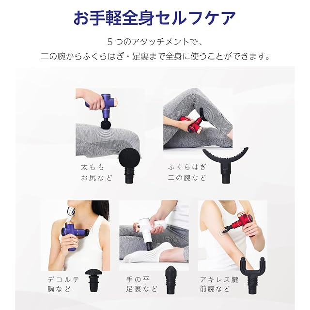 【アタッチメント5種付き】ボール型/ポイント型/カーブ型/U字型/アーチ型の5種類のアタッチメント付き。アタッチメントを付け替えることで、カラダの各部位にフィットし最適なケアができます。