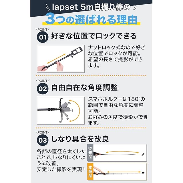 ✅【スペック】材質:アルミ (本体) ABS(スマホホルダー) サイズ(約):収納時100㎝ 最大500㎝ (5m) 重量:本体1100g スマホホルダー:58g ✅【lapsetブランド】日本の厳しい品質基準をクリアした信頼のlapset製品。購入後30日間の返品・返金付きで安心してお買い求めいただけます。