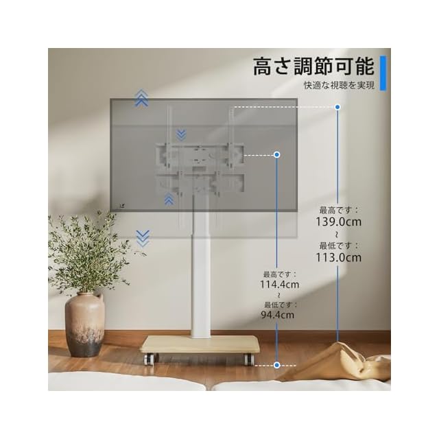 ラック回転、高さ調節:より良い視野を提供するために、ブラケットは左右に30度調節できます。リビングルームだけでなく、キッチンや寝室にも、回転角度によって、違う美しい景色を捉えることができます。そして、テレビスタンド本体の高さはラックの取り付け位置により、1130 mmから1390 mmまで調節可能です。