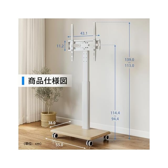 商品仕様:テレビ台サイズ:長さ55cm*幅38cm*高さ113cmから139 cmまで。メディア棚は最大荷重が5 kgです。移動式のTVスタンドはオフィス、ホーム、学校、会議室、ホテル、空港、ロビー、病院、研究所、教会、ショッピングモールなどの場所に最適です。ホワイトスタンドの後ろにケーブル管理システムが付きます。ケーブルを管理しやすく、テレビとAV機器の周辺を綺麗に保ちます。