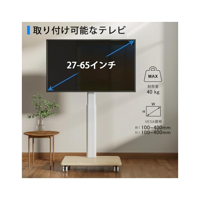 VESA規格対応:VESAはテレビの背面に取り付けたネジ穴間の距離です。テレビスタンドキャスターのVESAは100x100 mmから400x400 mmまで対応可能です。大部の27から65インチまでのテレビ、ディスプレイやモニターなどに適用されます。ご注意:ラック荷重は40 kgを超えてはいけません。
