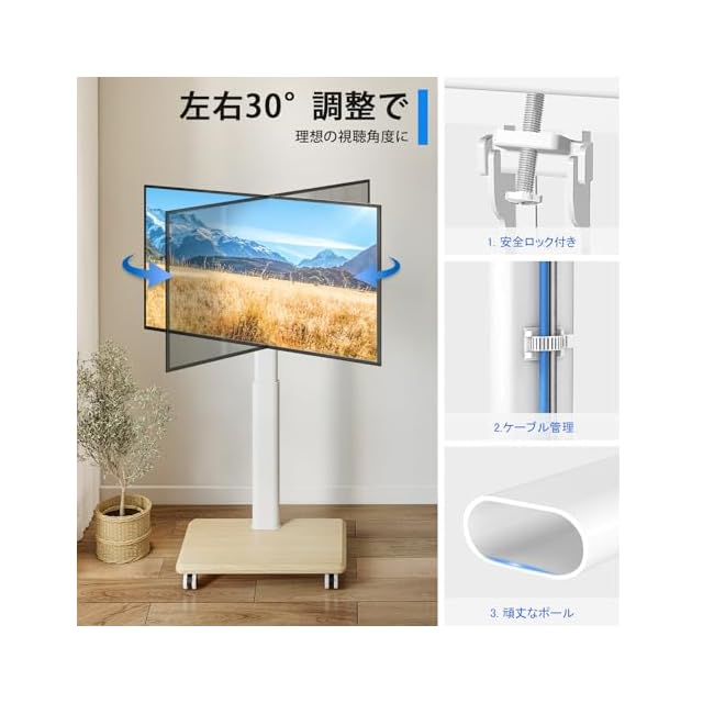 商品名:Rfiver テレビスタンドホワイト 壁寄せテレビスタンド キャスター付き tvスタンド 27~65インチ対応 テレビ台 移動式 ラック回転 高さ調整可能 木製ベース 耐荷重40 kg VESA400x400まで 業務用 展示用 家用 木目調 白
