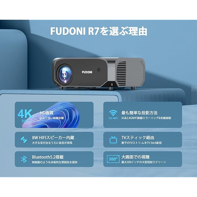 商品名:FUDONI プロジェクター 小型 家庭用 【2025最新進化 4K対応】高輝度 24000LM 1080P解像度 ホームプロジェクター 短距離投影300"大画面 Hi-Fiスピーカー内蔵 360°回転 天井吊り可能 台形補正 50%-100%ズーム機能 スマホ/タブレット/PC/TV Stick/DVD/PS4/PS5/ゲーム機接続可 HDMIケーブル/AVケーブル/リモコン