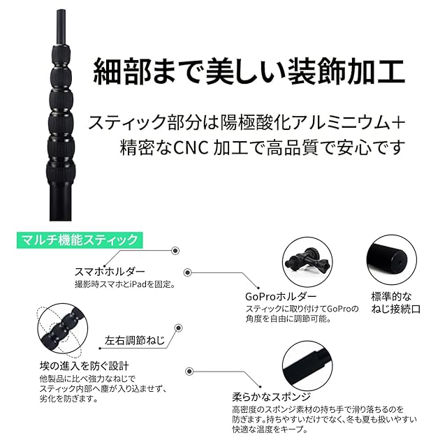 ✅【こだわり機能】ポールを伸ばして好きなところでロックができます。長さを調整できるので希望の長さで使用ができます。また、角度調整も可能です。スマホやアクションカメラの撮影角度も自由に調整ができます。従来品と比べ、ポールの太さも太くなりました。それによりしなり具合も改良されています。安定した撮影を実現しました。