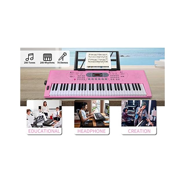 Hricane キーボード ピアノ 電子ピアノ 61鍵盤 200種類音色 200種類リズム 60曲デモ曲 LCDディスプレイ搭載 光る鍵盤 楽器 日本語パネル ヘッドフォン対応 子供 初心者 練習用 USBケーブルと日本語説明書付き (ピンク)