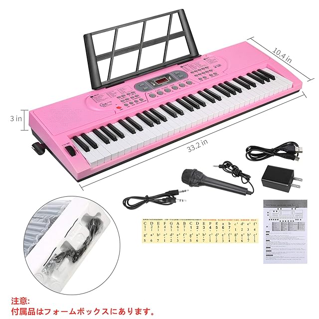 【付属品&二年安心ほ しょう】マイク、譜面台、USBケーブル、鍵盤ステッカー、オーディオケーブル、日本語説明書。白鍵盤:長さ10.2センチ 幅2センチ、黒鍵盤:長さ6.5センチ 幅1.2センチ。付属品は製品の両側のフォームの中に置いてあります。商品の不良や誤配送があった場合、返品・新品交換をご希望の場合は、お気軽にお問い合わせください。