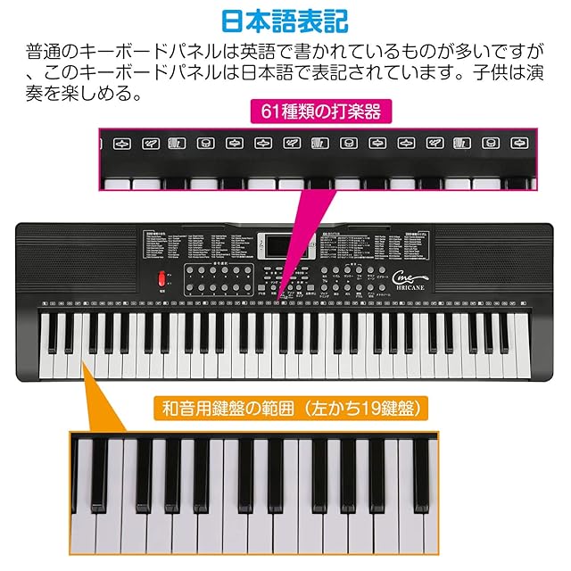 商品名:Hricane キーボード ピアノ 電子ピアノ 61鍵盤 200種類音色 200種類リズム 60曲デモ曲 LCDディスプレイ搭載 光る鍵盤 楽器 日本語パネル ヘッドフォン対応 子供 初心者 練習用 USBケーブルと日本語説明書付き (ブラックH663)