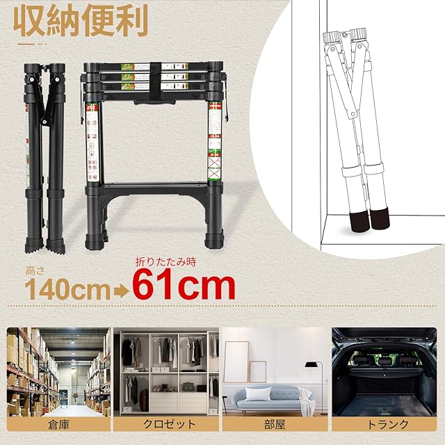 【軽くて長持ち!高品質アルミ素材】 伸縮脚立は高品質のアルミニウム合金を使用しており、軽量で長持ちします。さらに、表面はアルミナ処理が施されており、耐水性や耐腐食性に優れています。梯子の全長は1.4m+1.4mで、収納時のサイズは61cm×46cm×11cmです。最大150kgまでOK。ずっしり重い作業もラクラク支えます。