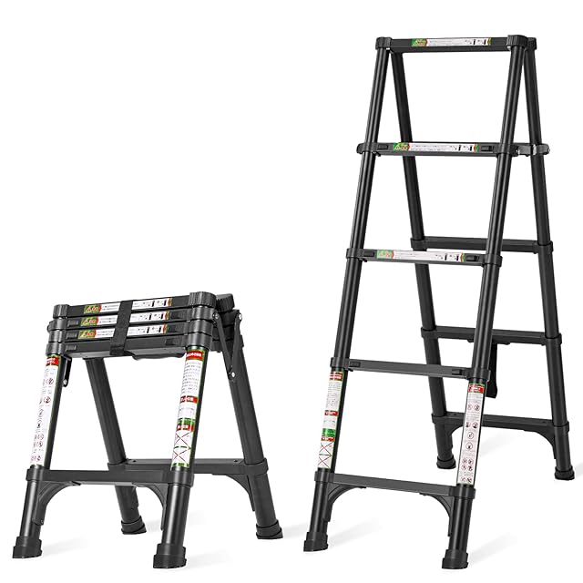 商品名:RIKADE 伸縮脚立はしご 踏み台 軽量伸縮自在 折りたたみ 持ち運び便利 室内屋外両用 アルミはしご 自動・安全ロック付き 耐荷重150 kg (ブラック, 1.4+1.4m)