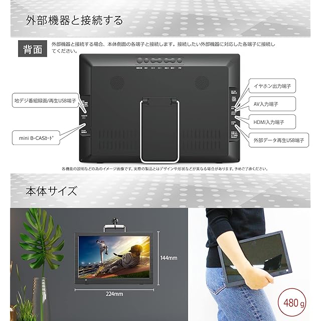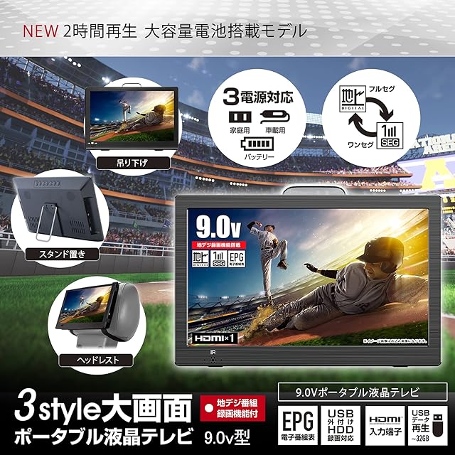 <製品仕様><br> ■電源<br> ・ACアダプター:入力AC100-240V 50/60Hz 出力DC12V<br> ・カーアダプター:入力DC12V 出力12V 1.2A<br> ・バッテリー:2000mAh 7.4V 満充電時間約3.5~4時間 連続使用時間約2時間<br> <br> ■待機消費電力<br> 1W以下<br> <br> ■消費電力<br> 約12W<br> <br> ■スピーカー<br> 2W×2(ステレオ)<br> <br> ■入力端子<br> アンテナ、DC電源、USB×2(番組録画、メディア再生)、AV、HDMI、イヤホン、minB-CASカードスロット<br> <br> ■対応フォーマット<br> ・音声:MP3/WMA/WAV/AAC<br> ・動画:MPG4/WMV/AVI/3GP<br> ・画像:JPEG/BMP<br> ・テキスト:TXT<br> ※上記形式でも再生できない場合があります。<br> ※すべての再生のはしておりません。<br> <br> ■受信周波数<br> 地上デジタル:UHF(13~62ch)(フルセグ/ワンセグ)<br> ※インターネット回線を利用した地デジ受信環境には非対応。<br> <br> ■液晶パネル<br> ・タイプ:TFT-LCD<br> ・サイズ:9インチ<br> ・フレームレート:60Hz<br> ・アスペクト比:16:9<br> ・解像度:800×480画素<br> ・輝度:200cd/㎡<br> ・コントラスト比:400:1(Typ:)TM<br> ・応答速度:16(Typ.)(Tr+Td)ms<br> ・視野角:35/15/45/45(min)(CR≧10)<br> <br> ■録画用ハードディスク容量<br> ・地デジ録画用ポート:~500GBまでのメモリーを推奨<br> ※2TBまで動作テストしていますが表示に数十秒、時間を要します。<br> ※大容量になるほどリスト表示は遅くなります。<br> ・データ再生用ポート:~32GBまでのメモリーを推奨<br> <br> ■許容範囲温度<br> 0~40℃<br> <br> ■リモコン到達距離<br> 3m以内(本体リモコン受光部正面から)<br> <br> ■外形寸法<br> 約W224×D26.5×H144mm<br> <br> ■本体質量<br> 約480g<br> <br> ■付属品<br> ACアダプター、カーアダプター、リモコン(動作テスト用電池を含む)、AVケーブル、車載用バック、簡易アンテナ、イヤホン、miniB-CASカード、取扱説明書兼書<br>