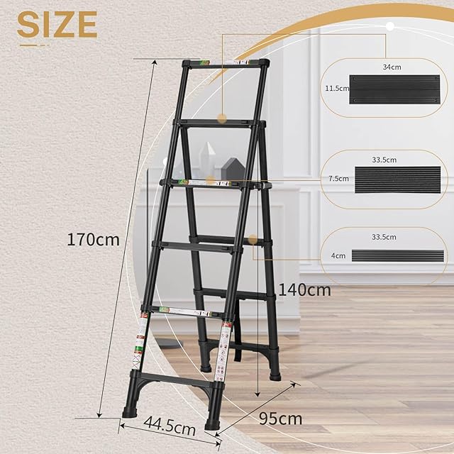RIKADE 伸縮脚立はしご 踏み台 軽量伸縮自在 折りたたみ 持ち運び便利 室内屋外両用 アルミはしご 自動・安全ロック付き 耐荷重150 kg (ブラック, 1.4+1.7m)
