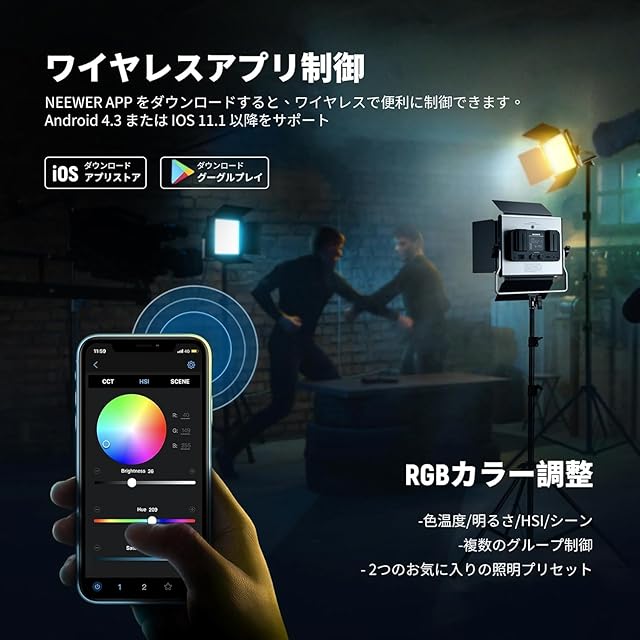 【インテリアプリ制御】専用アプリ「NEEWER」で最大15m距離でワイヤレス操作が可能。チャンネル(1-8/ALL)を選択し、明るさ・色温度・色相(0〜360°)・彩度(0〜100%)を調整して、お気に入りの照明設定を2種類保存することができます。(オペレーティングシステム要件: Android4.3+/iOS11.1+対応)