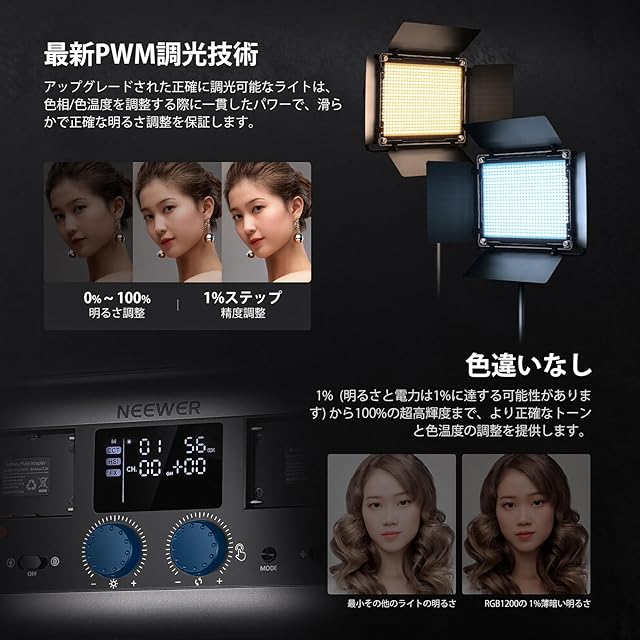 【高演色性&精密調光】RGBビデオライトは1056個高品質LEDを搭載し、60W高出力で、最大[email protected]明るさとCRI97+/TLCI98+高演色性照明を提供します。NEEWERリニアPWM調光技術により、1%-100%滑らかな明るさ調整が可能で、色温度2500K-8500K、360°フルRGBカラー調整に対応し、スタジオ照明や動画撮影に最適です。