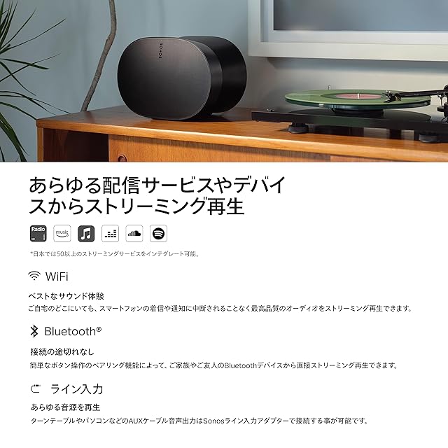 【新体験のユーザー・インターフェイス】Sonos Era 300は、Sonos Voice Control、Sonosアプリ、Apple AirPlay 2、Bluetoothで即座かつ思いのままに 音楽を操作できるほか、タッチ操作によるスライドコントロールを新たに搭載し、さらに直感的な操作性を実現しています。 【接続オプションを拡充】WiFiやBluetoothでお気に入りのコンテンツをストリーミング再生。AUXケーブルとSonosライン入力アダプターを使用すれ ば、ターンテーブルなどの外部プレーヤーも直接接続できます。