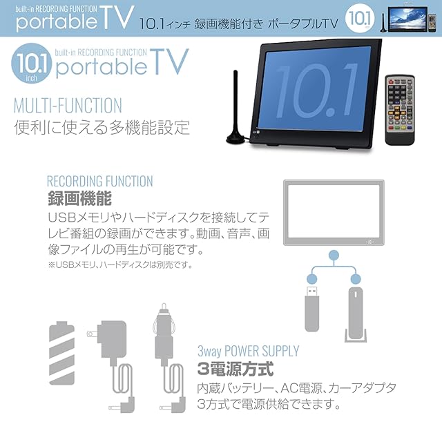 <製品仕様><br> ■電源<br> ACアダプター:入力AC100-240V 50/60Hz 出力DC12V<br> カーアダプター:入力DC12V 出力12V 1.2A<br> バッテリー:2000mAh 7.4V 満充電時間約3.5~4時間 連続使用時間約2時間<br> <br> ■待機消費電力<br> 1W以下<br> <br> ■消費電力<br> 約14W<br> <br> ■スピーカー<br> 2W×2(ステレオ)<br> <br> ■入力端子<br> アンテナ、DC電源、USB×2(番組録画、メディア再生)、AV、HDMI、イヤホン、minB-CASカードスロット<br> <br> ■対応フォーマット<br> 音声:MP3/WMA/WAV/AAC<br> 動画:MPG4/WMV/AVI/3GP<br> 画像:JPEG/BMP<br> テキスト:TXT<br> ※上記形式でも再生できない場合があります。<br> ※すべての再生のはしておりません。<br> <br> ■受信周波数<br> 地上デジタル:UHF(13~62ch)(フルセグ/ワンセグ)<br> ※インターネット回線を利用した地デジ受信環境には非対応。<br> <br> ■液晶パネル<br> タイプ:TFT-LCD<br> サイズ:10.1インチ<br> フレームレート:60Hz<br> アスペクト比:16:9<br> 解像度:1024×600画素<br> 輝度:200cd/㎡<br> コントラスト比:400:1(Typ:)TM<br> 応答速度:16(Typ.)(Tr+Td)ms<br> 視野角:45/45/60/60(min)(CR≧10)<br> <br> ■録画用ハードディスク容量<br> 地デジ録画用ポート:~500GBまでのメモリーを推奨<br> ※2TBまで動作テストしていますが表示に数十秒、時間を要します。<br> ※大容量になるほどリスト表示は遅くなります。<br> データ再生用ポート:~32GBまでのメモリーを推奨<br> <br> ■許容範囲温度<br> 0~40℃<br> <br> ■リモコン到達距離<br> 3m以内(本体リモコン受光部正面から)<br> <br> ■外形寸法<br> 約W246×D24.5×H160mm<br> <br> ■本体質量<br> 約580g<br> <br> ■付属品<br> ACアダプター、カーアダプター、リモコン(動作テスト用電池を含む)、AVケーブル、車載用バック、簡易アンテナ、イヤホン、miniB-CASカード、取扱説明書兼書<br>