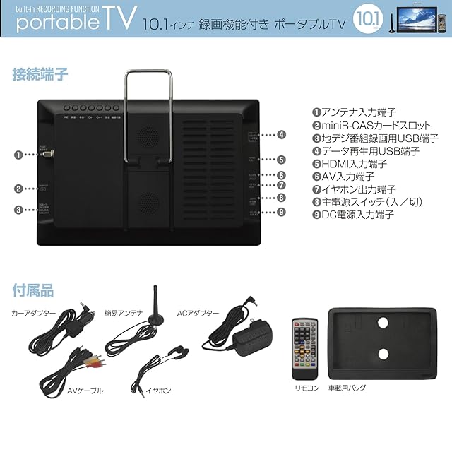[東京Deco] 10型 ポータブル 液晶テレビ フルセグ搭載 10.1インチ 録画機能搭載 車載用バック付き [録画機能/HDMI搭載/3電源方式/3スタイル置き/フルセグワンワグ自動切替] アンテナケーブル 壁掛け 地デジ ワンセグ ポータブル RCA TV 9 10 o000