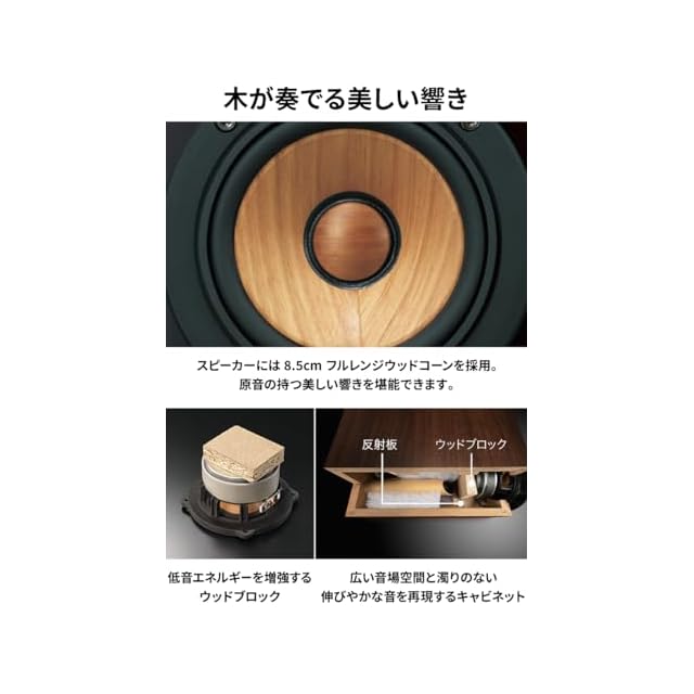 【木が奏でる美しい響きを堪能できる】“スピーカーは楽器でありたい"という想いから生まれた、“木"を振動板とする“ウッドコーンスピーカー"、定位感のよさとキレのある表現力を可能にする8.5cmフルレンジユニットを採用。艶のある美しい中高域と豊かな低域再生を実現。