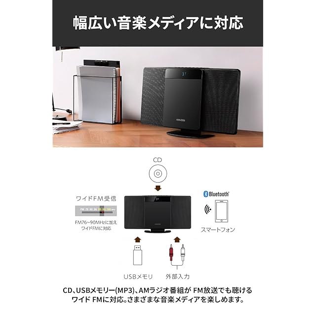 【さまざまな音楽メディアに対応】CD、ラジオ(ワイドFM)、USB再生、スマートフォンやタブレットの音楽をワイヤレスで楽しめるBluetooth機能を搭載し、様々な音楽ソースを高音質で楽しめます 。
