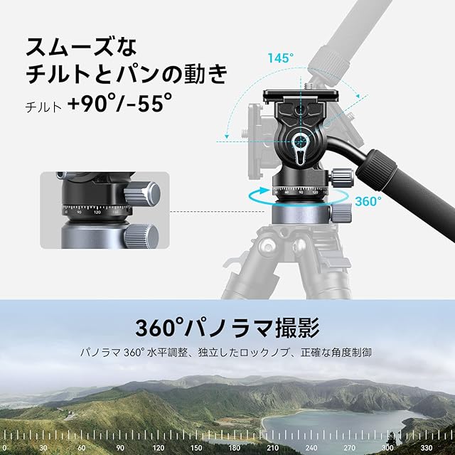【360°パン&-55°/+90°チルト調整可能】 統合されたレベリングベース設計により、、10°/-10°の角度範囲調整で、素早く簡単にレベリングを行うことができます。このビデオヘッドフルード雲台は固定ダンピングを備えており、スムーズな操作感を提供します。 パノラマ撮影やビデオ録画用のハンドルグリップを使って、ヘッドを+90°/-55°傾けることができ、360°回転させてマルチアングル撮影が可能になり、複数の角度の写真撮影に最適です。