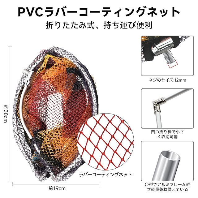 材質:枠:アルミ(折りたたみ式) ネット:PVC(ラバーコーティングネット) 網の深さ:28cm