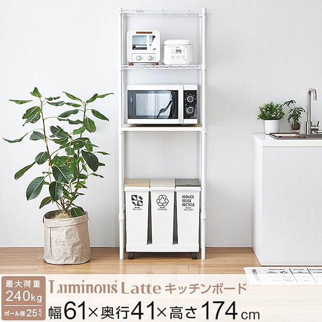 ドウシシャ ルミナス ラテ キッチン収納 ゴミ箱上収納 ホワイト 白 3段 幅60 おしゃれ スチールラック 棚 ウッドシェルフ 全体耐荷重240kg スリム 幅61×奥行41×高さ174cm 水や傷に強い 作業台 ポール径25mm LL6018-KB