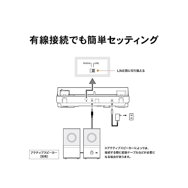有線接続でも簡単セッティング。・アクティブスピーカーにつなぐだけで、レコードの⾳が聴けるワイヤレスだけでなく、有線接続でも簡単にレコードの音を楽しめます。フォノイコライザーを内蔵しているため、付属のオーディオケーブルをお持ちのアクティブスピーカーにつなぐだけで準備完了。追加機器の購入や面倒な配線といった手間は一切ありません。・フォノイコライザーを内蔵し、PHONO/LINE出力を選択可能不要