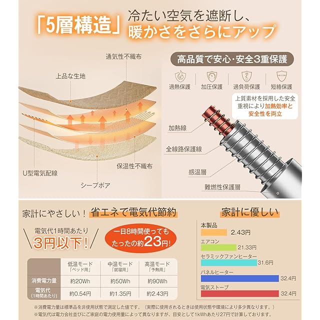 【頭寒足熱配線・PSE認証済みの正規品】電気ブランケットは就寝時に重宝する頭寒足熱配線を採用しており、冷たくなりがちな足元をしっかりあたため、胸元をソフトにあたためられます。そして、電気ブランケットが経済産業省認証機関による電気用品安全法の検査を通過し、安全基準を満たした認証(PSE)を取得!より安全性が向上しまして、安心にご使用いただけます。五層の安全構造及び過熱保護機能や均一加熱などにより、安心して心地よい睡眠をサポートします。また、過電圧保護、漏電保護、過負荷保護、短絡保護など、安全装置がしっかり備わっているので、万が一の時も安心です。