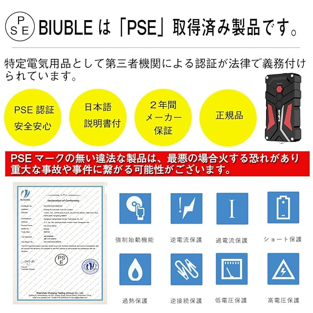 【安全保護&PSE認証】PSE認証(証明書番号:WUX202012155200PSC)商品で、高品質のリチウムバッテリーおよびスマートクランプによる回路保護機能は安全性能を随分アップします。操作不当による短絡/逆接続/過放電/過電流/逆電流/逆極性/過充電が発生の時、声と光のアラームが起こし、安全保護を提供します。【スーパー保護機能】ジャンプスターターは安全性の高いリチウム電池を採用したもので、さらにスマートクランプが配置されており、逆充電保護・短絡保護・過熱保護・過充電保護・過電流保護・過放電保護・逆接続保護・逆極性保護など、計8種類の保護機能を搭載し、初心者の方も安心に使えます。