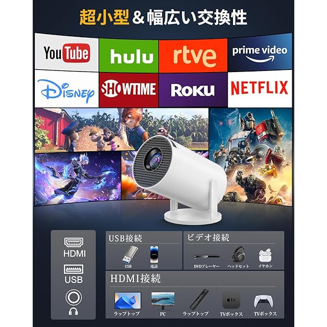 【Android TV搭載・スマートプロジェクター】プロジェクター 小型 に最新のAndroid TV 11.0を搭載。ビデオ、Netflix、YouTubeなど8,000以上のお気に入りのチャンネルやビデオを、高価なデバイスを買い足すことなく簡単に視聴でき、よりエンターテイメントな体験を提供します。(ご注意:バージョンの関係でGoogle PlayストアからDisney+はダウンロードできません。Disney+を視聴したい場合は、 Fire TV Stickを別途購入してください。)