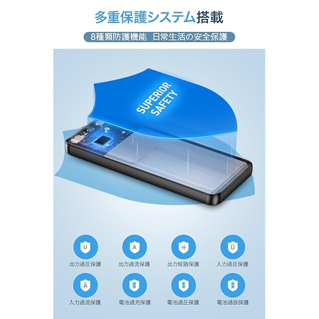 【22800mAh大容量モバイルバッテリー・軽量 小型】バッテリー容量は22800mAhの大容量サイズを搭載、1度の充電で数日使用も可能、安心感が違います。複数機器を同時に充電できる大容量に加え、急速蓄電に対応しているため、短時間で充電が完了し、外出先でもスマホやタブレットを快適に使えます。また、コンセント不要で充電できるので、様々なシーンで活用が可能です。高出力・大容量搭載のモバイルバッテリーとしては約215gの軽量化を実現。サイズは約139.8x68x16.2mmと持ち運びに便利なモバイルバッテリーです。