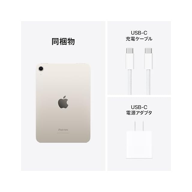 商品名:Apple iPad mini(A17 Pro):Apple Intelligence、8.3 インチ Liquid Retina ディスプレ イ、512GB、Wi-Fi 6E、12MP フロントカメラ/12MP バックカメ ラ、Touch ID、一日中使えるバッテリー ‒ スターライト