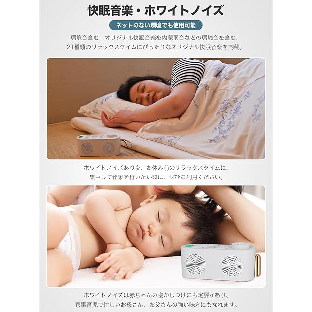 【快眠音楽を内蔵】環境音含む、オリジナル快眠音楽を内蔵雨音などの環境音を含む、19種類のリラックスタイムにぴったりなオリジナル快眠音楽を内蔵。環境音などのホワイトノイズには心地よい音環境に整える効果があるため、夜、お休み前のリラックスタイムに、集中して作業を行いたい時に、ぜひご利用ください。