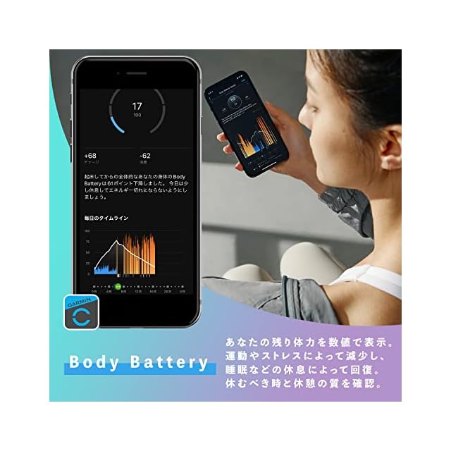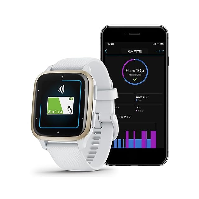健康管理機能:Body Battery、ストレスレベル、睡眠スコア、血中酸素トラッキング、フィットネス年齢、生理・妊娠トラッキング、水分補給 / スポーツ管理機能:高精度GPS、様々なスポーツ機能 / スマート機能:各種通知、Suica決済、援助要請・事故検知、Android 及び iOS のどちらも利用可能