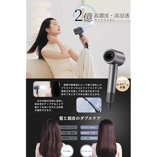 【2億高濃度マイナスイオン放出】 NISSYOヘアドライヤーは従来品の数十倍の2億もの高濃度マイナスイオンを放出します。 パワフルな風で髪に届け、表面をコーティングし、静電気を抑制。 髪の水分を保護し、マイナスイオンの力でキューティクルのダメージを修復します。