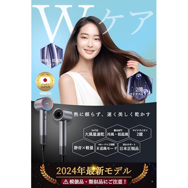 最新のNISSYO高速ドライヤーは、パワフルなACモーターが内蔵され、他社のドライヤーの3倍の空気を吸い込み、高圧で高速な風を生み出すことで、髪を根元から素早く乾かすことができます。20℃の冷風から60℃の熱風まで4つの風温と2つの風速モードを備え、あらゆるニーズに合わせて使い分けられる大風量ヘアドライヤーです。さらに、2億もの高濃度マイナスイオンを放出し、髪に届けて表面をコーティングし、静電気を抑制。髪の水分を保護し、マイナスイオンの力でキューティクルのダメージを修復します。 また、AI温度コントロールとNTCサーモスタットの採用により、毎秒110回の温度測定とコントロールが行われ、髪表面の水分を素早く取り去りながらも、過度な熱によるダメージを防ぎます。デリケートな頭皮でも安心してご利用いただけ、低騒音かつ超軽量なDCモーター設計で長時間の使用でも疲れにくく、美容師にも好評です。コンパクトなサイズで場所を取らず、高級感のあるギフト包装も備え、母の日や誕生日などのプレゼントに最適。さらに、国内正規品で一年間のメーカーが付いています。万が一商品に不具合があれば、規約に従い返金や交換などの対応をさせていただきます。商品に関するご質問やご不明点がございましたら、お気軽にお問い合わせください。この優れた機能と信頼性で、NISSYO高速ドライヤーは理想的なヘアケア製品となっており、ぜひお客様にご検討いただきたい逸品です。