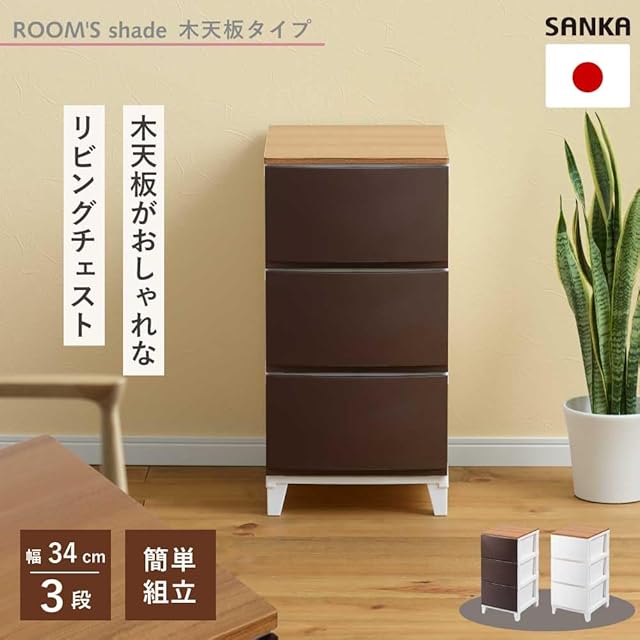 商品名:サンカ ルームス 木天板 収納 チェスト ブラウン スリム 3段 (幅34×奥行42×高さ68.5cm) スルっと引き出せて スキッと締まる引き出し キズ付きにくいマット加工パネル 簡単組み立て 日本製 衣装ケース タンス ROOM'S shade RSDM-S343BR