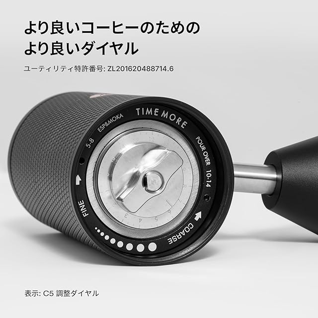 【C5コーヒーグラインダーの特徴】特許取得のS2C-042-IIIステンレス製バー(42mm)を採用し、高精度かつ効率的な粉砕を実現。1クリックあたり0.031mmの微調整可能な機構で、エスプレッソからフレンチプレスまで、好みの粗さを簡単に再現できます。