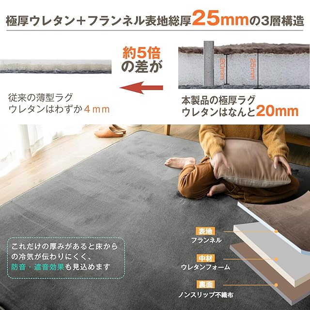 【極厚25mm・防音効果抜群】一般的なラグの厚みの3倍!厚さ約20mmの高密度ウレタンを使用し、底付き感を感じずゆったりくつろげます。体圧を均一に分散し、長時間座っていても疲れにくい。極厚ですので、お子供様とペットがマンション・集合住宅の中に飛び回っても下の階に音が響きにくいです。