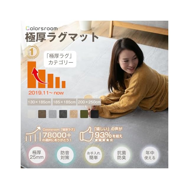 商品名:Colorsroom カーペット ラグ 極厚25mm 200×250cm 約3畳 クッションラグ 防音 厚手 撥水加工 防ダニ 抗菌 防臭 低ホルム もちもち ふわっと手触り ホットカーペット対応 低反発と同じ厚み ラグマット こたつ敷きマット リピングマット ライトグレー(NEW)VTJ049-200250-LGY