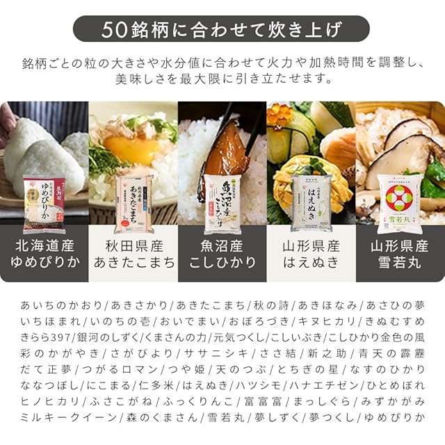 「米銘柄機能」「おこのみ炊き機能」など、よりお米の美味しさを引き出す機能が備わっています。[米銘柄:主要な銘柄を最適な火力と時間で、お米の美味しさを引き出し炊き上げます。][おこのみ炊き:お米の食感やかたさを自分好みの美味しさで炊き上げます。]
