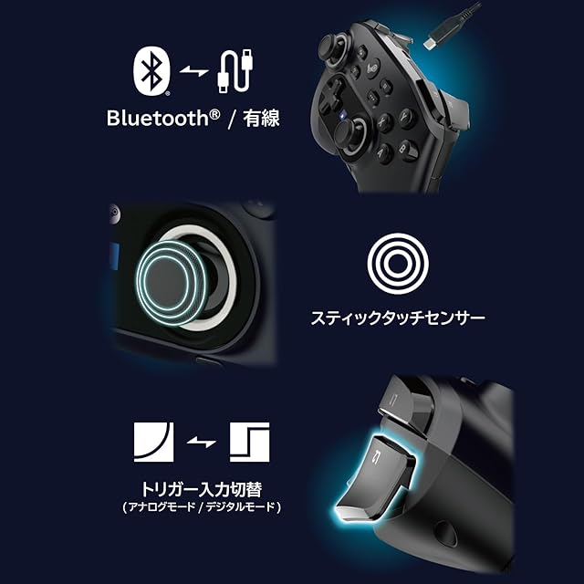 【製品仕様】 コントローラー ・外形寸法:(幅)約15.5cm × (奥行)約11cm × (高さ)約6cm ・質量: 約185g ・ケーブル長:約3m ・接続方式: Bluetooth2.4による無線接続 USB Type-A 接続 ・充電時間:約3.5時間 ※ 充電時間については目安となります。ご使用環境によっては時間が前後する可能性がございます。あらかじめご了承ください。 ※ 使用環境によって大幅に動作時間が短くなる可能性があります。 ・通信距離:約10m ※ 使用環境によって交信範囲が変動する可能性があります。 ・仕様周波数:2.4GHz帯 ・センサー:ジャイロセンサー、スティックタッチセンサー ケーブル ・ケーブル長:約3m ・接続端子:USB Type-A to Type-C