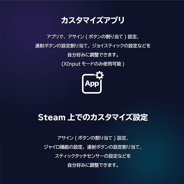 【ご注意】 ・ PCおよびSteam Deckのシステムソフトウェアによっては全ての機能がお使いいただけない場合があります。 その場合は、最新のシステムソフトウェアにバージョンアップしてからご利用ください。 ・ XInputは、有線接続時のみ使用可能です。 ※ 本品は以下の機能を搭載しておりません。 これらの機能を使用するゲームでは快適にプレイすることができません。 ・ 振動機能 ・ トラックパッド ・ヘッドフォンジャック 【内容品】 ・コントローラー × 1 ・USBケーブル(Type-A to Type-C) × 1 ・Bluetoothアダプタ(USB Type-A) × 1 ・取扱説明書 × 1