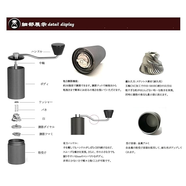 1.ブランド:TIMEMORE 型番:栗子 素材:外部:アルミ金属 刃:ステンレス 一部分:PC サイズ:本体147x52mm