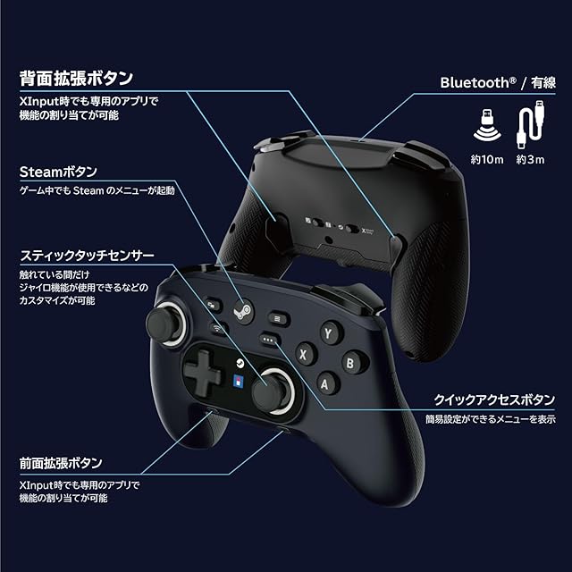 【対応機種】 PC ・必要環境:USB Type-A端子 ・入力規格:無線接続の場合 DirectInput 有線接続の場合 XInput / DirectInput ・対応OS:Windows11 / 10 Steam Deck Bluetooth2.4による無線接続、 または、ドッキングステーション(別売)を介してUSBケーブル(Type-A to Type-C)にて有線接続