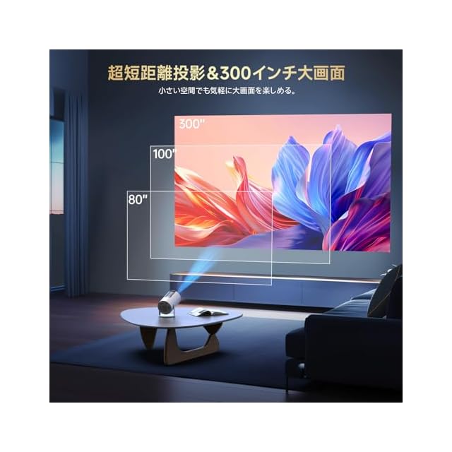 【300インチ大画面&短距離投影&50%ズーム&超小型・超軽量】モバイルプロジェクターは最大300インチまでの投影画面をサポートします。また、投影比率が市場の小型プロジェクターの中でも群を抜いており、40~130インチの大画面を0.7m~3.3mの距離で実現します。狭い部屋でも大きい画面で映像を楽しめます。また、画面の表示サイズを固定距離で100~50%を調整可能頻繁にプロジェクターの投影距離の調整も必要なく便利です。ソファーに座りながら、プロジェクターを動かなくてもリモコンで画面のサイズを調整することができます。ポータブルプロジェクターは長さ16.8cm、直径10.8cmのコンパクトサイズで、重さわずか700g。市場の他のミニプロジェクターと比べて、さらに小さく軽量。旅行やアウトドアに最適なパートナーです。どこでも手軽に映像を楽しむことができます!使わない時に、収納にも便利です。おしゃれでインテリアにも馴染みやすいので、どちらを選んでいいかわからない初心者には最適です。