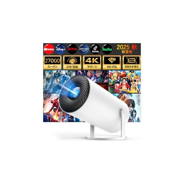 プロジェクター小型 知能自動台形補正&270°全方位回転&操作簡単 27000LM高輝度 4K対応1080P Wi-Fi6瞬間接続 Bluetooth5.4 天井投影 プロジェクター 家庭用 ホームプロジェクター モバイルプロジェクター HiFiスピーカー内蔵 短距離投影 50%ズーム スマホ/ノートパソコン/DVD/PS4/PS5/などに対応 日本語取扱説明書 3年