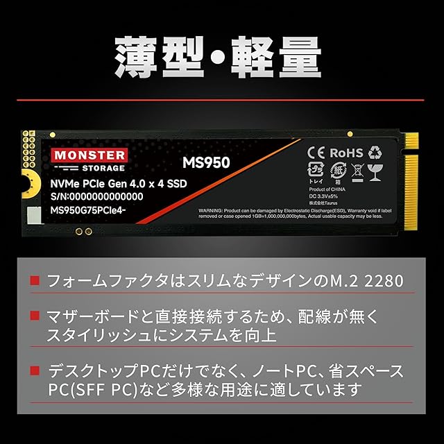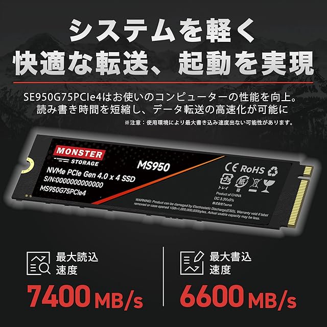 商品名:Monster Storage 1TB NVMe SSD PCIe Gen 4×4 最大読込: 7,400MB/s 最大書き:6,600MB/s PS5確認済み 放熱シート付き M.2 Type 2280 内蔵 SSD 3D TLC 国内正規品 メーカー5年 MS950G75PCIe4-01TB