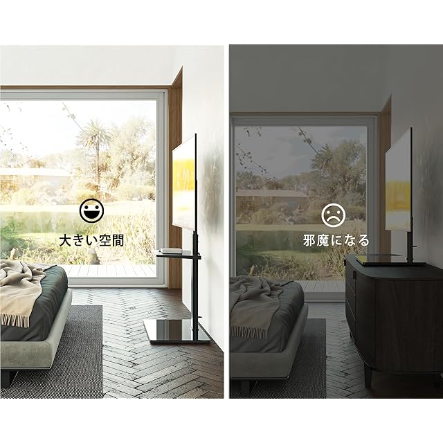 【配線を隠す】支柱のデザインにより、テレビスタンドの後ろにケーブル管理機能がありますので、配線はスタンドの後ろにきれいに収納でき、お部屋がスッキリとなります。底に滑り止めのゴムパッドが付いて、安定性が高いです。