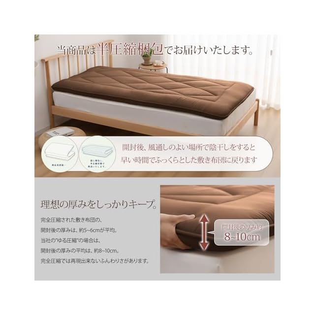 【種類】敷布団 敷き布団 /【素材】敷ふとん側地:ポリエステル100%/詰め物:ポリエステル100% /【サイズ】セミダブル (120×210×10cm) /【企画・製造】日本で企画し、中国で製造されたものです。【注意事項】開梱した直後からおやすみいただけますが、およそ1~2日ほどで厚みや形状が復元します。